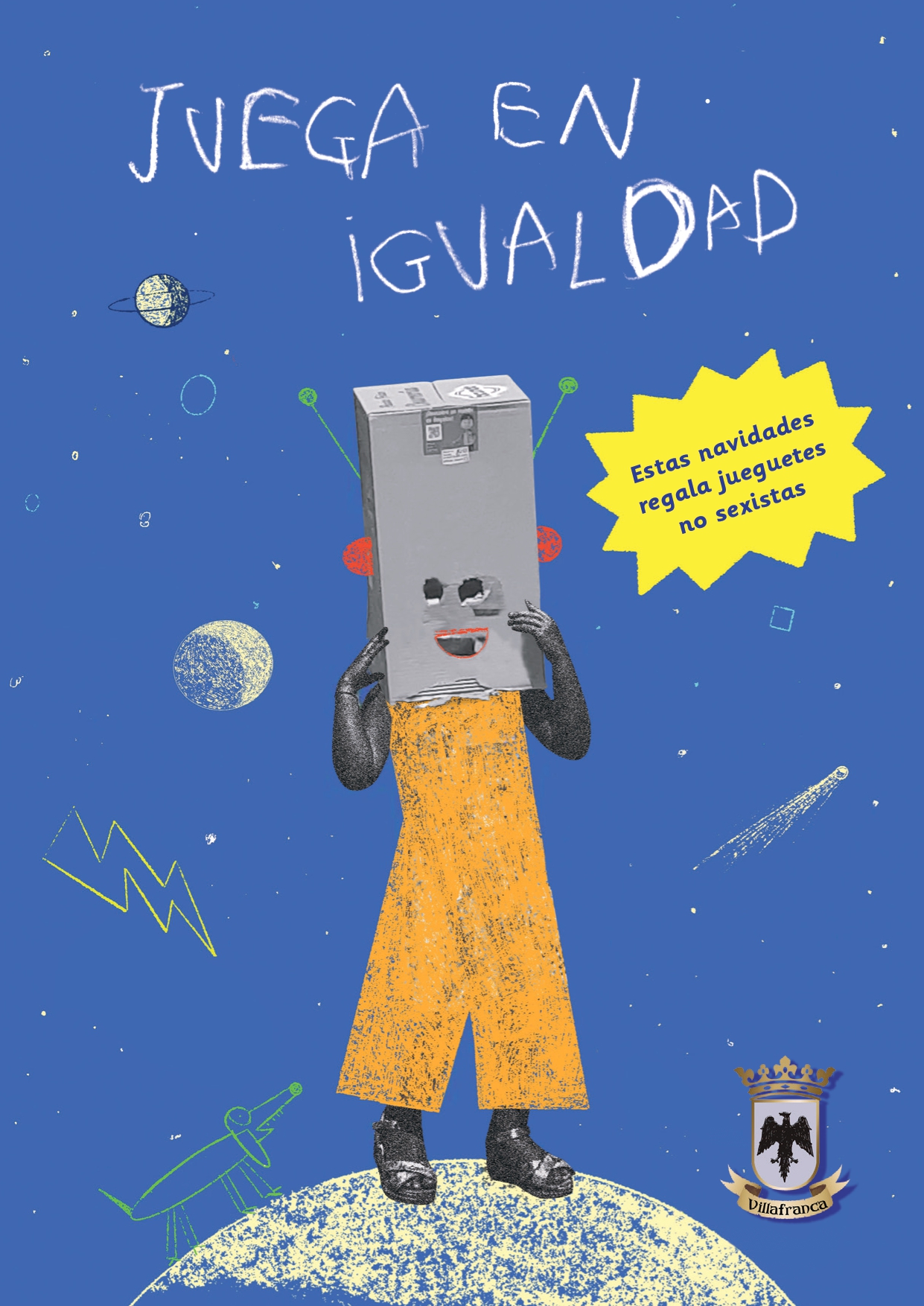 La campaña que lanza el Ayuntamiento, cuenta con el lema “JUEGA EN IGULADAD. Estas navidades regala juguetes no sexistas” y su ilustración quiere animaros a ir más allá de los estereotipos. Creemos que el protagonismo en la elección y disfrute de los juguetes debe seguir siendo la ilusión, la magia y la imaginación. Pero también defendemos que esta elección no debe estar limitada por estereotipos y roles sexistas.